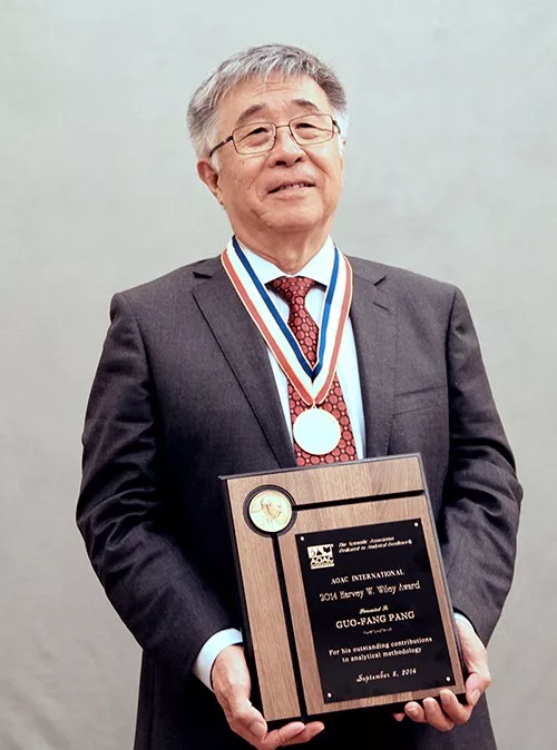 三十多年来励精图治、胸怀大局、自强不息,庞国芳始终致力于农药等化学污染物微量分析基础理论、应用技术和方法标准化研究,系统研究了世界常用1200多种农药九类色谱-质谱、核磁谱行为特征,构建了农药色谱-质谱、核磁数据库和图谱库;三十多年来上下求索,锐意进取、百折不挠,以扎实的技术基础与科学工作者的神圣使命感,攻克了多项技术难题,研究了农产品食品中微量农药提取、净化、分离、富集,以及快速筛查及精准定量的关键技术,研制了139项国家标准;三十多年来勇于创新、勇立潮头、攻关不止,他主持了3次有17个国家62个实验室参加的国际AOAC协同研究,研制了3项国际AOAC标准,开创了中国学者主持研究国际AOAC标准方法的先河。早在1995年,庞国芳去美国参加109次AOAC年会时,就萌生了对上百种农药残留同时检测技术进行研究的想法。2001年,他去德国汉堡参观国立卫生研究所的农药残留分析实验室时,听取了德国多残留检测国家标准的经验,渴望从事多残留检测技术研究的心愿更加强烈。但当时的实验室装备不具体条件,多残留食品检测技术研究也只是藏在他心里的一个梦想。但机会总是留给有准备的人,2002年,原国家质检总局发布内部明电,要求出口到加拿大的蜂蜜要检测300多项农药兽药化学残留物质。庞国芳在国家需要时敢于担重担,迎接挑战,向国家承诺300项检测项目一年内完成研究。几经周折,在获国家资金资助后,庞国芳团队参照德国卫生研究所残留分析实验室的装备,购买了关键设备,创建了第一个多残留研究的实验平台。庞国芳带领着他的科研团队,检索了20年国内外农药残留分析文献,确定了研究思路,确保这项研究旗开得胜。他设计了第一个多残留方法,蜂蜜、果汁和果酒中304种农药多残留方法国家标准研究成功,破解了当时我国蜂蜜世界三大主销市场设置的300多项技术贸易措施项目。纵观庞国芳院士所主持过的科研项目,不难发现这些项目基本都是国家质检系统项目,他凭借敏感的信息捕捉能力与科学工作者的使命感,抓住与行业发展紧密相关的技术关键点,用科学技术为外经贸发展服务。他目光紧盯世界科技和经济发展大趋势,瞄准国家外经贸发展的目标,前瞻性地选择事关国富民强的科研课题,他坚持研究的这些课题成果,有3项荣获国家科技进步奖二等奖(1998年、2004年和2008年)。积沙成塔 创新不止